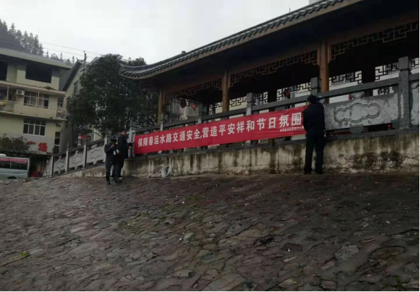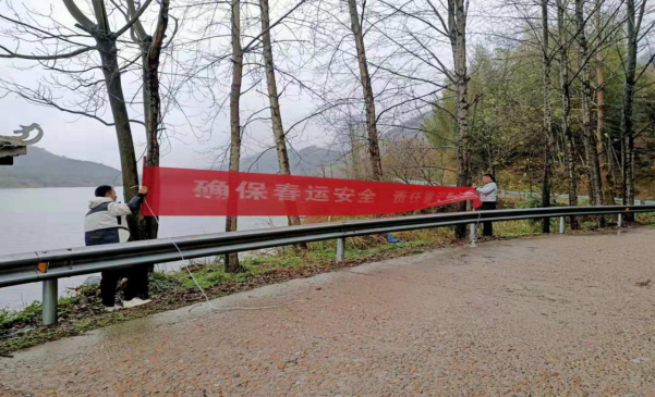 圖11 靖州縣水運事務中心工作人員在泡里渡口張貼春運安全宣傳橫幅