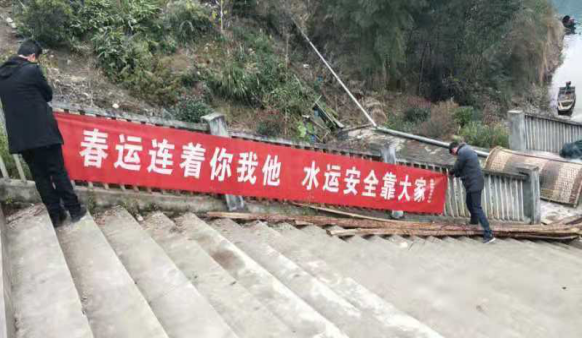 圖13 芷江縣水運事務中心工作人員在重點渡口碼頭顯要位置處懸掛春運安全橫幅