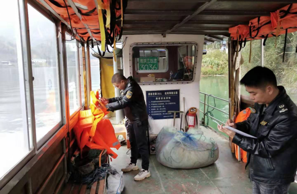 圖5 洪江市水運事務中心工作人員在官溪口渡口著重檢查船舶證書、船員證照、船上消防救生及防污染設備,并督促渡工嚴格遵守“六不發(fā)航”制度。