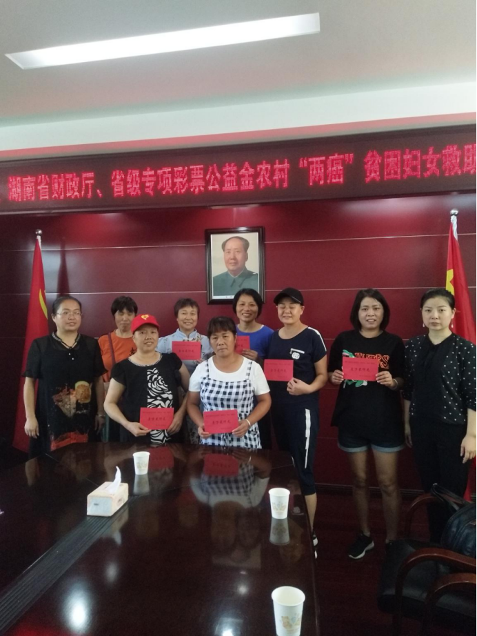 2019年上半年,懷化市共爭取到省級專項彩票公益金、農(nóng)村“兩癌”貧困婦女救助金32.4萬元,救助全市27名兩癌貧困患者,旨在幫助不幸患病的貧困婦女們能充分發(fā)揚“自尊、自信、自立、自強”精神,積極樂觀面對生活,堅強勇敢對抗病魔,把黨和政府的關(guān)愛化作戰(zhàn)勝疾病的力量,用頑強的意志創(chuàng)造美好燦爛的明天。(圖為8月28日,洪江市“兩癌”貧困婦女救助金發(fā)放現(xiàn)場)
