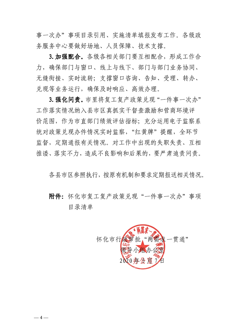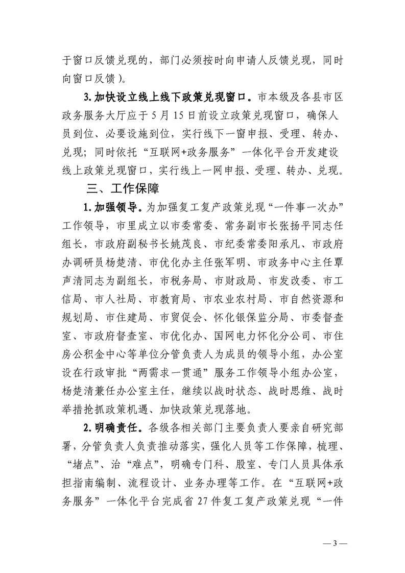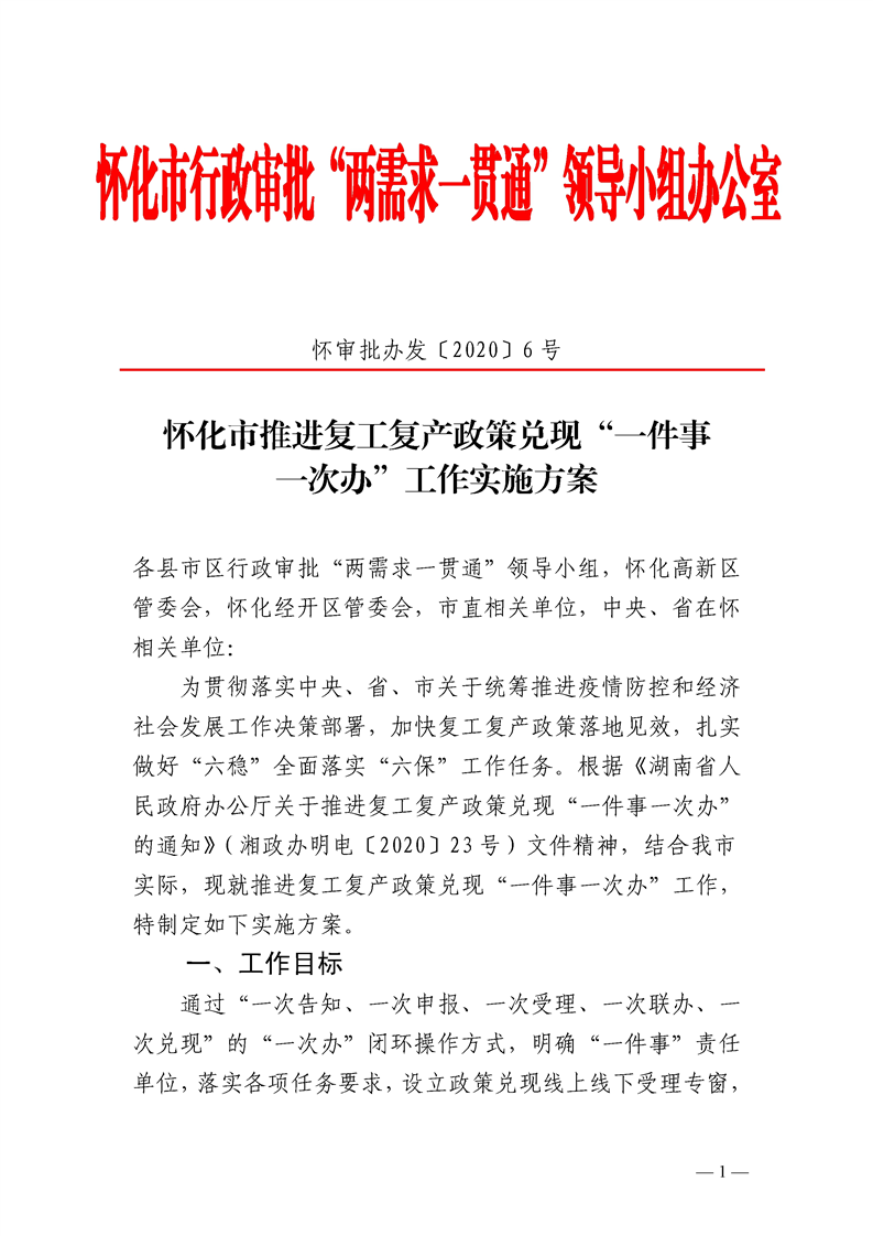 懷化市推進復(fù)工復(fù)產(chǎn)政策兌現(xiàn)“一件事一次辦”工作實施方案