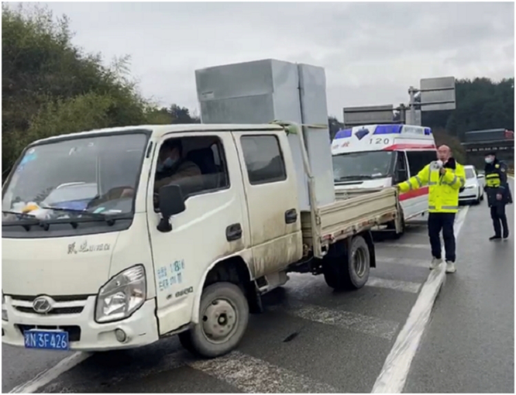 安江收費(fèi)站副站長(zhǎng)胡玨在收費(fèi)廣場(chǎng)引導(dǎo)車輛,幫助載有重癥病人的救護(hù)車快速通過。