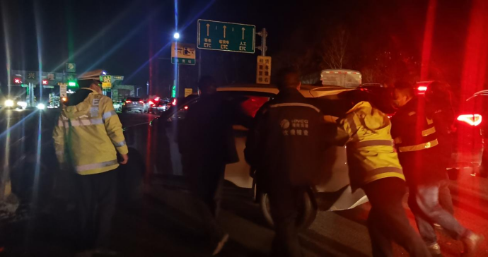 (一輛小車在興隆收費(fèi)站故障,工作人員合力將車輛推至安全區(qū)域。)