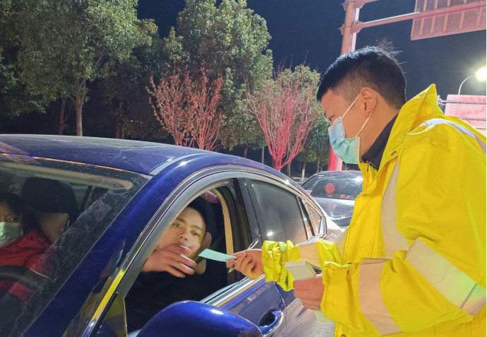 (“路燈”志愿者在通道服務(wù)區(qū)加油站引導(dǎo)車輛有序通行。)