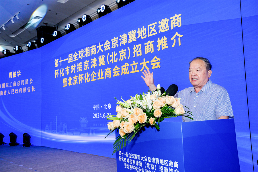 6月23日下午,第十一屆全球湘商大會京津冀地區(qū)邀商、懷化市對接京津冀(北京)招商推介暨北京懷化企業(yè)商會成立大會在北京舉行。圖為原國家工商總局局長、湖南省政府原省長周伯華出席并講話。(懷化日報(bào)全媒體記者 潘雨 攝)