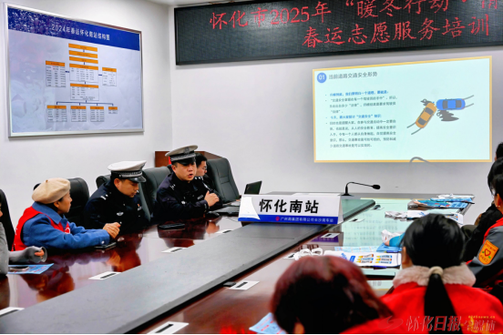 懷化高鐵南站副站長陳子佩及值班站長周鈺淳就車站的志愿服務崗位設置、服務流程、注意事項等進行了培訓;懷化市義工聯(lián)合會執(zhí)行會長田軍分享了春運志愿服務的經(jīng)驗和技巧;懷化市公安局交警支隊直屬四大隊中隊長羅祖超進行了交通安全宣講,讓志愿者們知道了如何在服務過程中向旅客宣傳交通安全知識,引導他們安全出行。